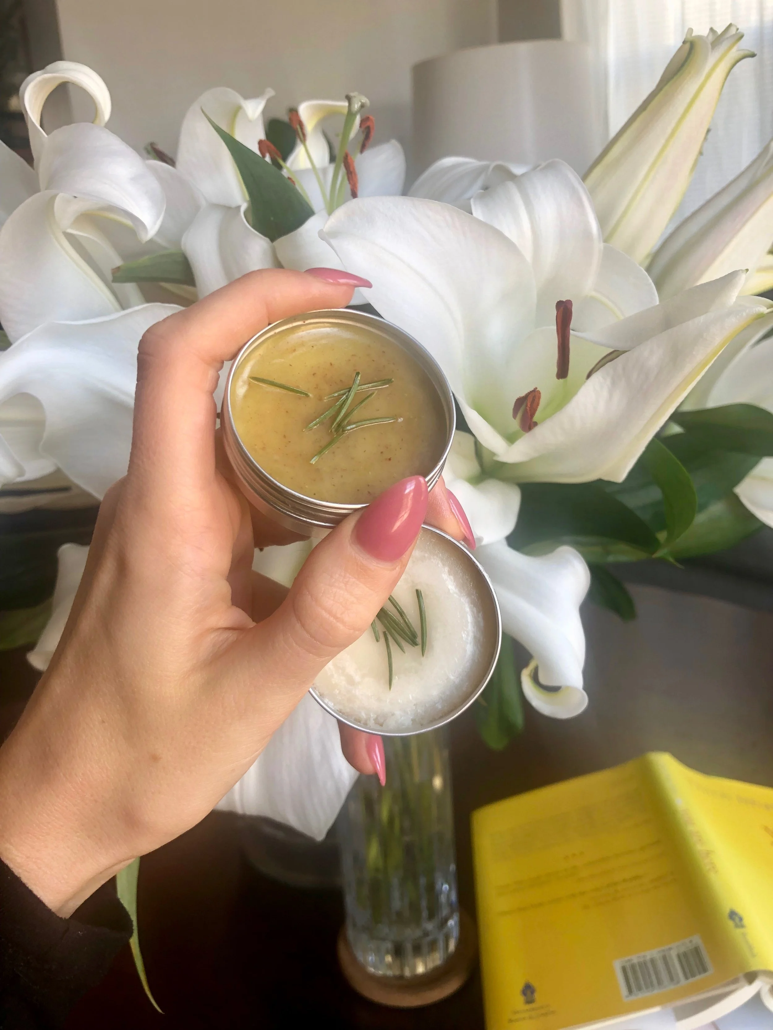 Made some little salves from white pine pitch that @connectedkitchen and I found on a hike yesterday. One made with tallow and one with olive oil, both topped with some blue spruce needles. They smell so heavenly 🥰🌲✨